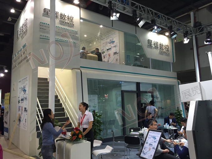 契合星輝數(shù)控的品牌形象和產(chǎn)品特性,采用框型結(jié)構(gòu),再搭配燈具燈光的效果,襯托出展位簡約、便捷的氛圍,突出一種精致、簡約的時(shí)尚品味。