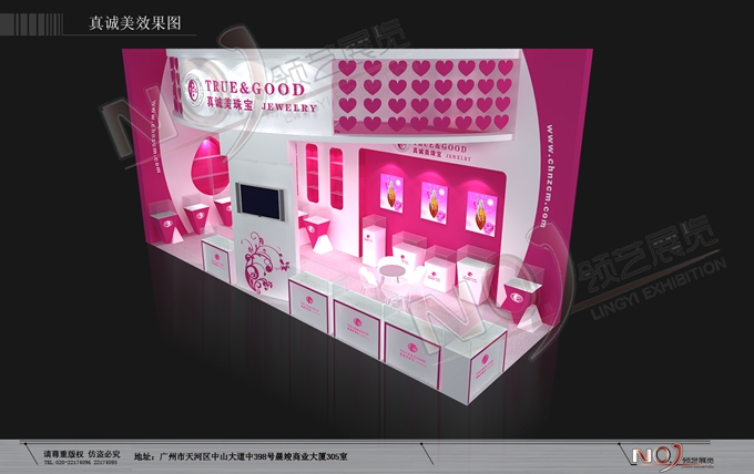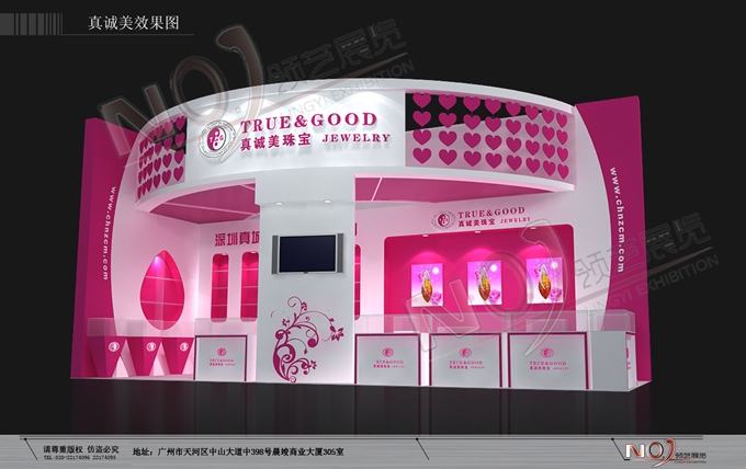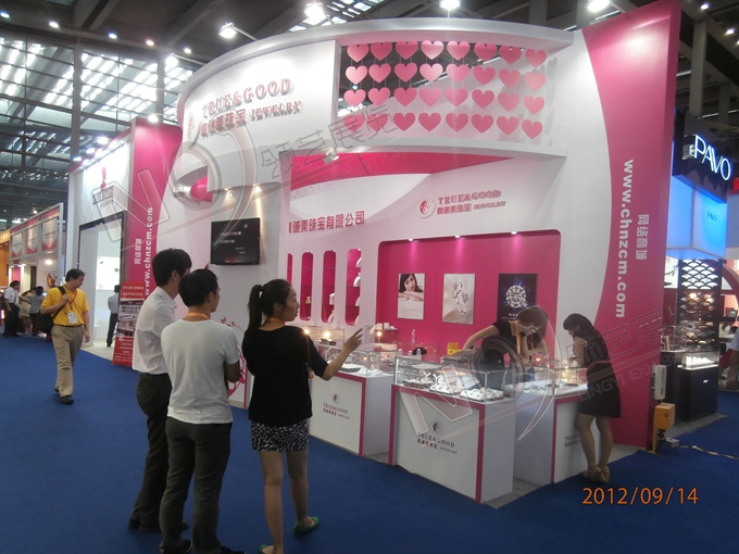 契合真誠美珠寶的品牌形象和產品特性,以弧形結構為主造型,再搭配燈具燈光的效果,襯托出展位絢麗、商務的氛圍,突出一種典雅、尊貴的時尚品味。