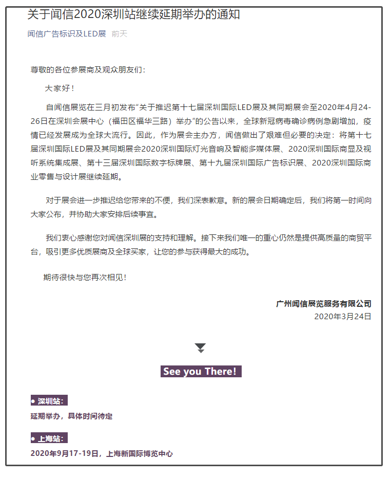 據(jù)LED展設(shè)計(jì)搭建公司領(lǐng)藝展覽了解到,自聞信展覽在三月初發(fā)布“關(guān)于推遲第十七屆深圳國際LED展及其同期展會(huì)至2020年4月24-26日在深圳會(huì)展中心(福田區(qū)福華三路)舉辦”的公告以來,全球新冠病毒確診病例急劇增加,疫情已經(jīng)發(fā)展成為全球大流行。因此,作為展會(huì)主辦方,聞信做出了艱難但必要的決定:將第十七屆深圳國際LED展及其同期展會(huì)2020深圳國際燈光音響及智能多媒體展、2020深圳國際商顯及視聽系統(tǒng)集成展、第十三屆深圳國際數(shù)字標(biāo)牌展、第十九屆深圳國際廣告標(biāo)識(shí)展、2020深圳國際商業(yè)零售與設(shè)計(jì)展繼續(xù)延期。如需LED展設(shè)計(jì)請聯(lián)系領(lǐng)藝展覽,希望我們能在LED展搭建上為您添磚加瓦,祝各位朋友收獲多多,滿載而歸!