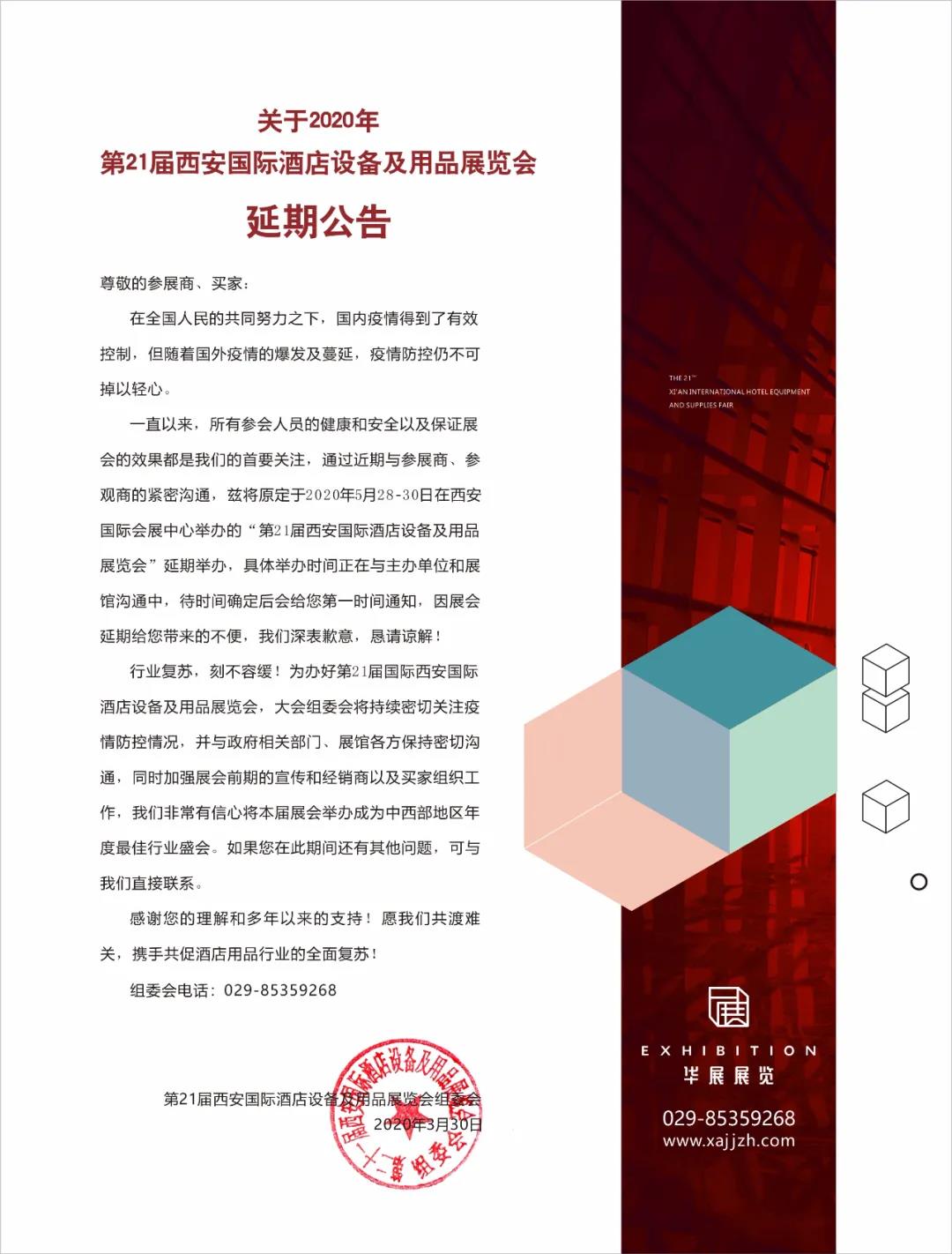 根據(jù)酒店用品展設(shè)計(jì)搭建公司領(lǐng)藝展覽了解到,2020年西安國際酒店用品展將延期舉辦。如需酒店用品展設(shè)計(jì)請聯(lián)系領(lǐng)藝展覽,希望我們能在酒店用品展搭建上為您添磚加瓦,祝各位朋友收獲多多,滿載而歸!