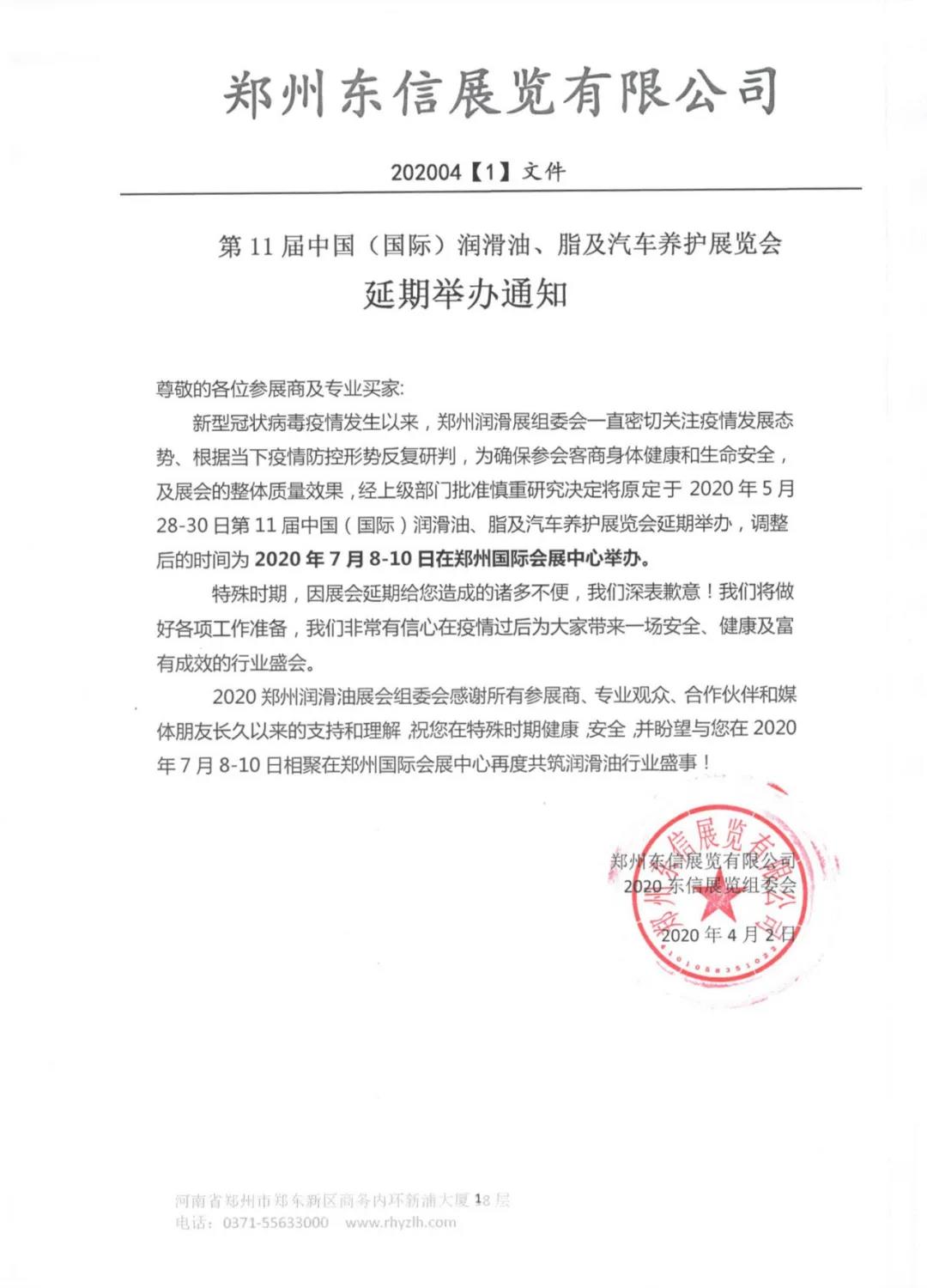 根據(jù)潤滑油展設(shè)計搭建公司領(lǐng)藝展覽了解到,受新冠肺炎疫情影響,原定于2020年5月28-30日舉辦的第11屆中國潤滑油、脂及汽車養(yǎng)護展覽會延期至2020年7月8-10日在鄭州國際會展中心舉辦。如需潤滑油展設(shè)計請聯(lián)系領(lǐng)藝展覽,希望我們能在潤滑油展搭建上為您添磚加瓦,祝各位朋友收獲多多,滿載而歸!