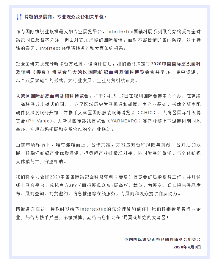 根據(jù)紡織面料展設(shè)計(jì)搭建公司領(lǐng)藝展覽了解到,2020中國國際紡織面料及輔料(春夏)博覽會(huì)與大灣區(qū)國際紡織面料及輔料博覽會(huì)合并舉辦,集中資源,以“雙展雙驅(qū)”的形式,為行業(yè)發(fā)展、企業(yè)商貿(mào)引航布局。