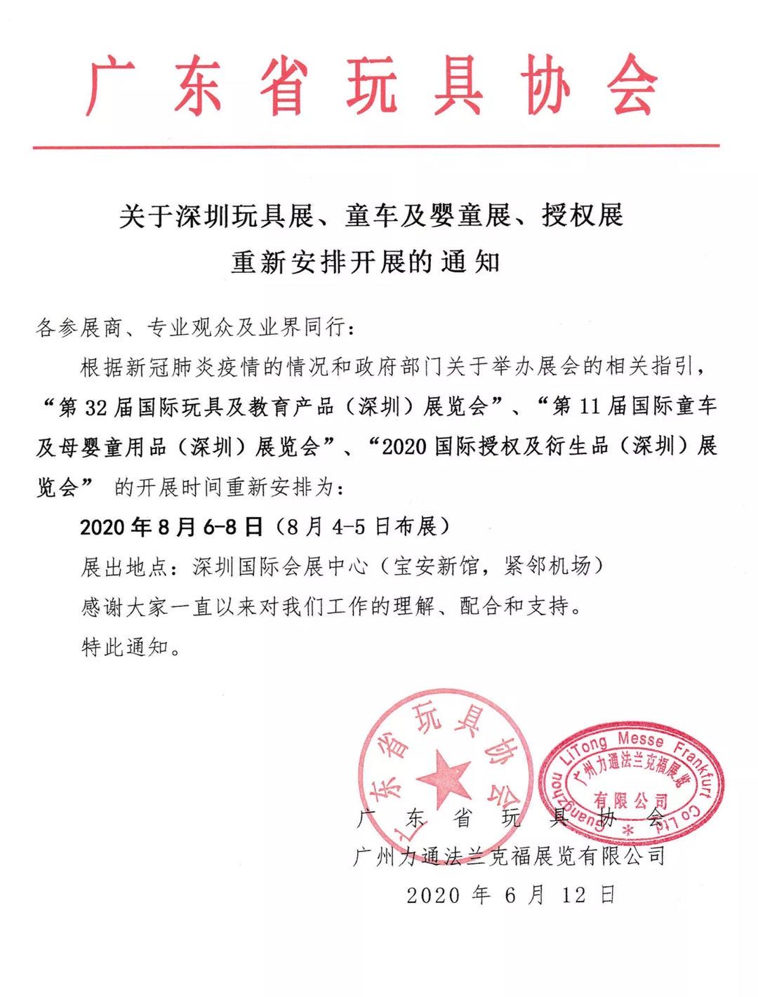 為進一步促進玩具、教育和嬰童及IP授權產業發展,為我國廣大兒童提供更多優質新穎的相關產品,引領新消費提振內需,繁榮國內流通市場,廣東省玩具協會、廣州力通法蘭克福展覽有限公司、法蘭克福展覽(香港)有限公司將于2020年8月6-8日,在深圳國際會展中心(寶安新館)共同舉辦“第32屆國際玩具及教育產品(深圳)展覽會”“第11屆國際童車及母嬰童用品(深圳)展覽會”“2020國際授權及衍生品(深圳)展覽會”(下統稱“深圳玩具展”)。