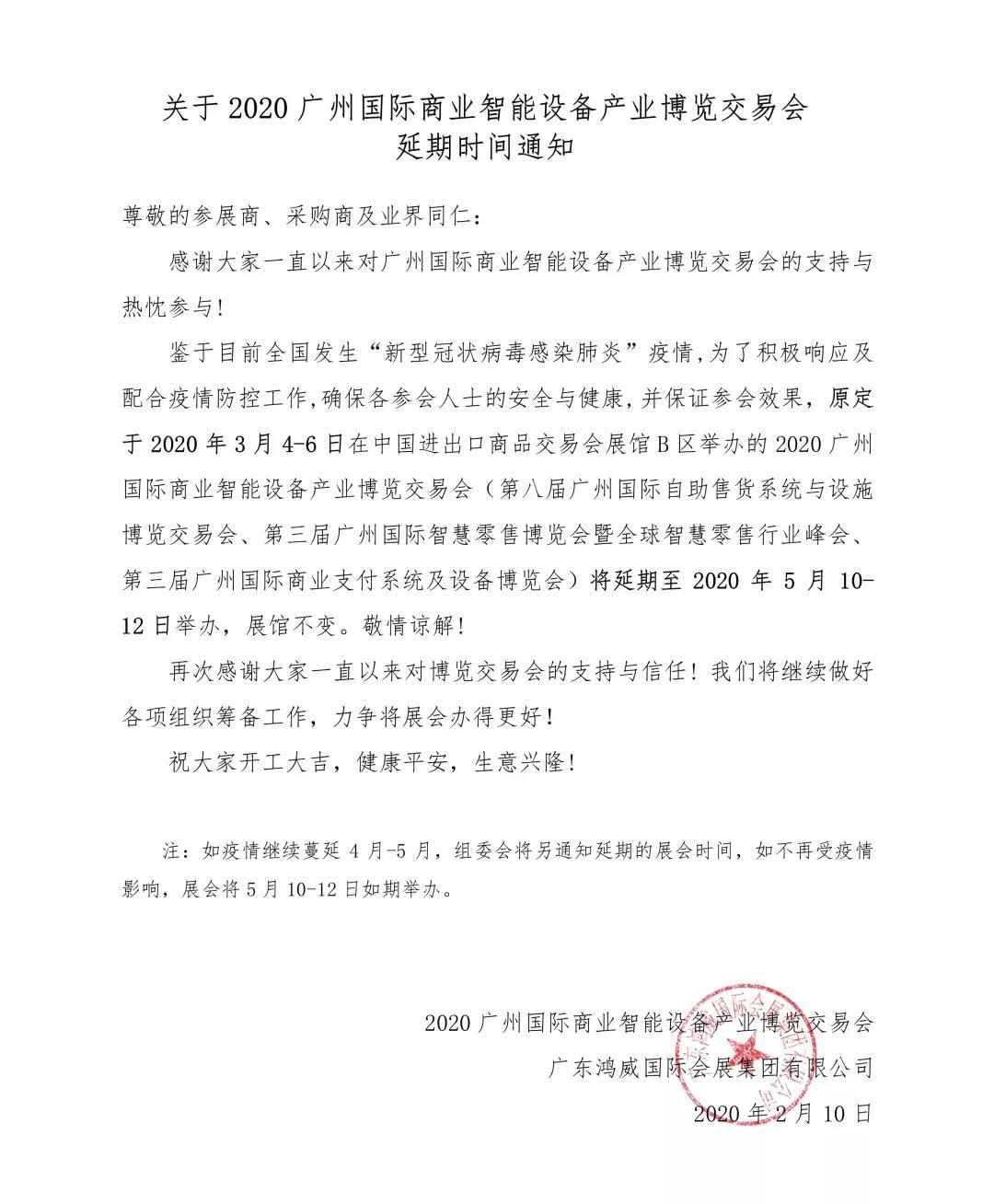 根據廣州智慧零售展設計搭建公司領藝展覽解到,原定于 2020 年 3 月 4-6 日在中國進出口商品交易會展館 B 區舉辦的 2020 廣州國際商業智能設備產業博覽交易會(第八屆廣州國際自助售貨系統與設施博覽交易會、第三屆廣州國際智慧零售博覽會暨全球智慧零售行業峰會、 第三屆廣州國際商業支付系統及設備博覽會)將延期至 2020 年 5 月 10- 12 日舉辦。如需廣州智慧零售展設計請聯系領藝展覽,希望我們能在廣州智慧零售展搭建上為您添磚加瓦,祝各位朋友收獲多多,滿載而歸!