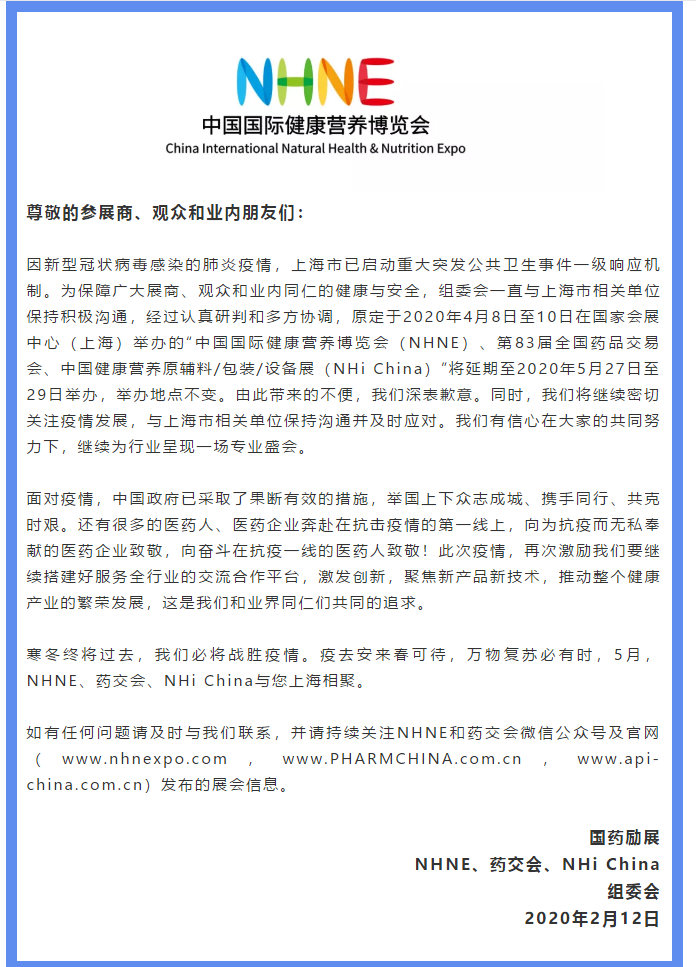 因新型冠狀病毒感染的肺炎疫情,上海市已啟動重大突發公共衛生事件一級響應機制。為保障廣大展商、觀眾和業內同仁的健康與安全,原定于2020年4月8日至10日在國家會展中心(上海)舉辦的“中國國際健康營養博覽會(NHNE)、第83屆全國藥品交易會、中國健康營養原輔料/包裝/設備展(NHi China)”將延期至2020年5月27日至29日舉辦,舉辦地點不變。我們將繼續密切關注展會動態,希望我們能在上海健康展搭建上為您添磚加瓦,祝各位朋友收獲多多,滿載而歸!上海健康展設計搭建公司領藝展覽向奮斗在抗疫一線的醫藥人致敬!期待5月,NHNE、藥交會、NHi China與您上海相聚!