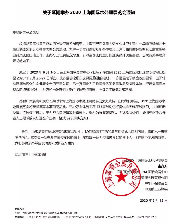 為全力支持打贏疫情防控阻擊戰,貫徹落實上海市疫情防控工作領導小組的防疫工作指導方針,切實保障廣大展商和觀眾的身體健康和安全,確保展覽會的展示和觀展效果,原定于2020年6月3-5日在上海國家會展中心(虹橋)舉辦的2020上海國際水處理展覽會將延期至2020年8月25-27日舉辦。我們將繼續密切關注展會動態,希望我們能在上海水展搭建上為您添磚加瓦。!上海水展設計搭建公司領藝展覽在此非常時刻仍將提供全天候在線服務,共同抗擊疫情。預祝各位朋友收獲多多,滿載而歸!