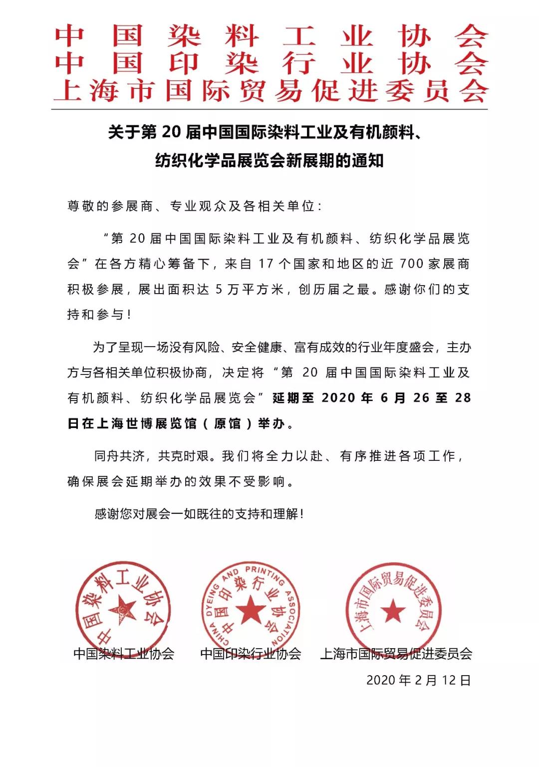 根據(jù)上海染料展設計搭建公司領藝展覽解到,為進一步做好疫情防控工作,切實保障廣大展商、觀眾及相關工作人員的健康與安全、確保參展效果,原定于2020年4月8至10日在上海世博展覽館舉辦的“2020中國國際染料工業(yè)及有機顏料、紡織化學品展覽會”將延期舉辦。如需上海染料展設計請聯(lián)系領藝展覽,希望我們能在上海染料展搭建上為您添磚加瓦,祝各位朋友收獲多多,滿載而歸!