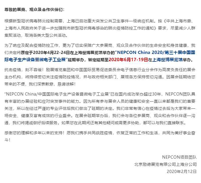 根據上海電子展設計搭建公司領藝展覽解到為了響應及配合疫情防控工作,更為了切實保障廣大參展商、觀眾及合作伙伴的生命安全和身體健康,我們決定將原定于2020年4月22-24日在上海世博展覽館舉辦的“NEPCON China 2020/第三十屆中國國際電子生產設備暨微電子工業展”延期舉辦,暫定延期至2020年6月17-19日在上海世博展覽館舉辦。領藝展覽為您上海電子展設計搭建保駕護航。