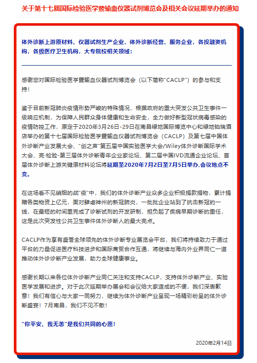 鑒于目前新冠肺炎疫情形勢嚴(yán)峻的特殊情況,根據(jù)政府的重大突發(fā)公共衛(wèi)生事件一級響應(yīng)機(jī)制,為保障人民群眾身體健康和生命安全,全力做好新型冠狀病毒感染的疫情防控工作,據(jù)上海檢驗(yàn)醫(yī)學(xué)展搭建商領(lǐng)藝展覽了解到原定于2020年3月26日-29日在南昌綠地國際博覽中心和綠地鉑瑞酒店舉辦的第十七屆國際檢驗(yàn)醫(yī)學(xué)暨輸血儀器試劑博覽會(CACLP)及第七屆中國體外診斷產(chǎn)業(yè)發(fā)展大會、“創(chuàng)之聲”第五屆中國實(shí)驗(yàn)醫(yī)學(xué)大會/Wiley體外診斷國際學(xué)術(shù)大會、亮·檢驗(yàn)-第三屆體外診斷青年企業(yè)家論壇、第二屆中國IVD流通企業(yè)論壇、首屆體外診斷上游關(guān)鍵原材料論壇將延期至2020年7月2日至7月5日舉辦,會議地點(diǎn)不變。領(lǐng)藝展覽為您上海檢驗(yàn)醫(yī)學(xué)展設(shè)計搭建保駕護(hù)航。
