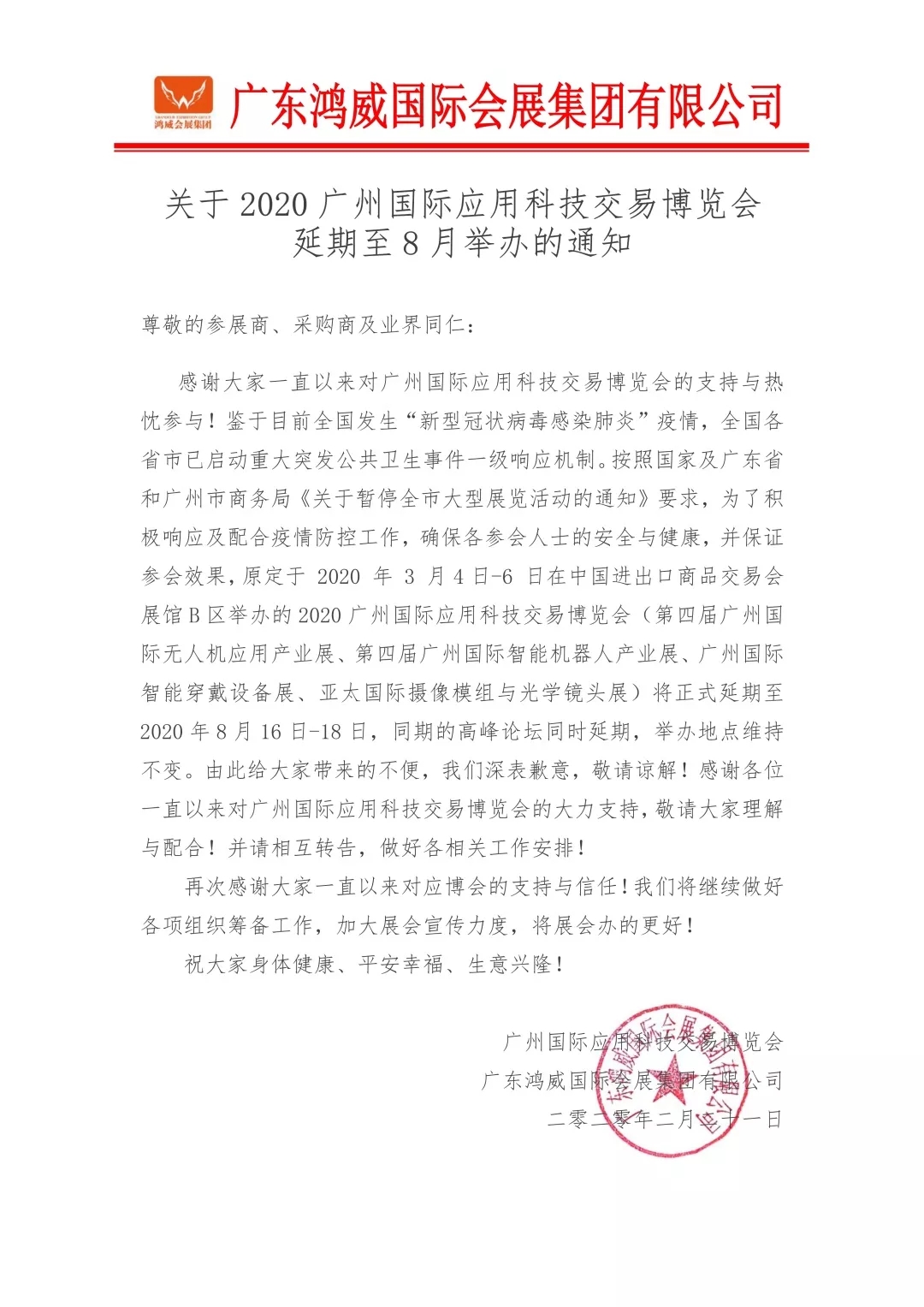 根據(jù)應(yīng)用科技展設(shè)計搭建公司領(lǐng)藝展覽解到,鑒于目前全國發(fā)生“新型冠狀病毒感染肺炎”疫情,全國各省市已啟動重大突發(fā)公共衛(wèi)生事件一級響應(yīng)機制。按照國家及廣東省和廣州市商務(wù)局《關(guān)于暫停全市大型展覽活動的通知》要求,為了積極響應(yīng)及配合疫情防控工作,確保各參會人士的安全與健康,并保證參會效果,原定于2020年3月4日-6日在中國進(jìn)出口商品交易會展館B區(qū)舉辦的2020廣州國際應(yīng)用科技交易博覽會(第四屆廣州國際無人機應(yīng)用產(chǎn)業(yè)展、第四屆廣州國際智能機器人產(chǎn)業(yè)展、廣州國際智能穿戴設(shè)備展、亞太國際攝像模組與光學(xué)鏡頭展)將正式延期至2020年8月16日-18日,同期的高峰論壇同時延期,舉辦地點維持不變。如需應(yīng)用科技展設(shè)計請聯(lián)系領(lǐng)藝展覽,希望我們能在應(yīng)用科技展搭建上為您添磚加瓦,祝各位朋友收獲多多,滿載而歸!