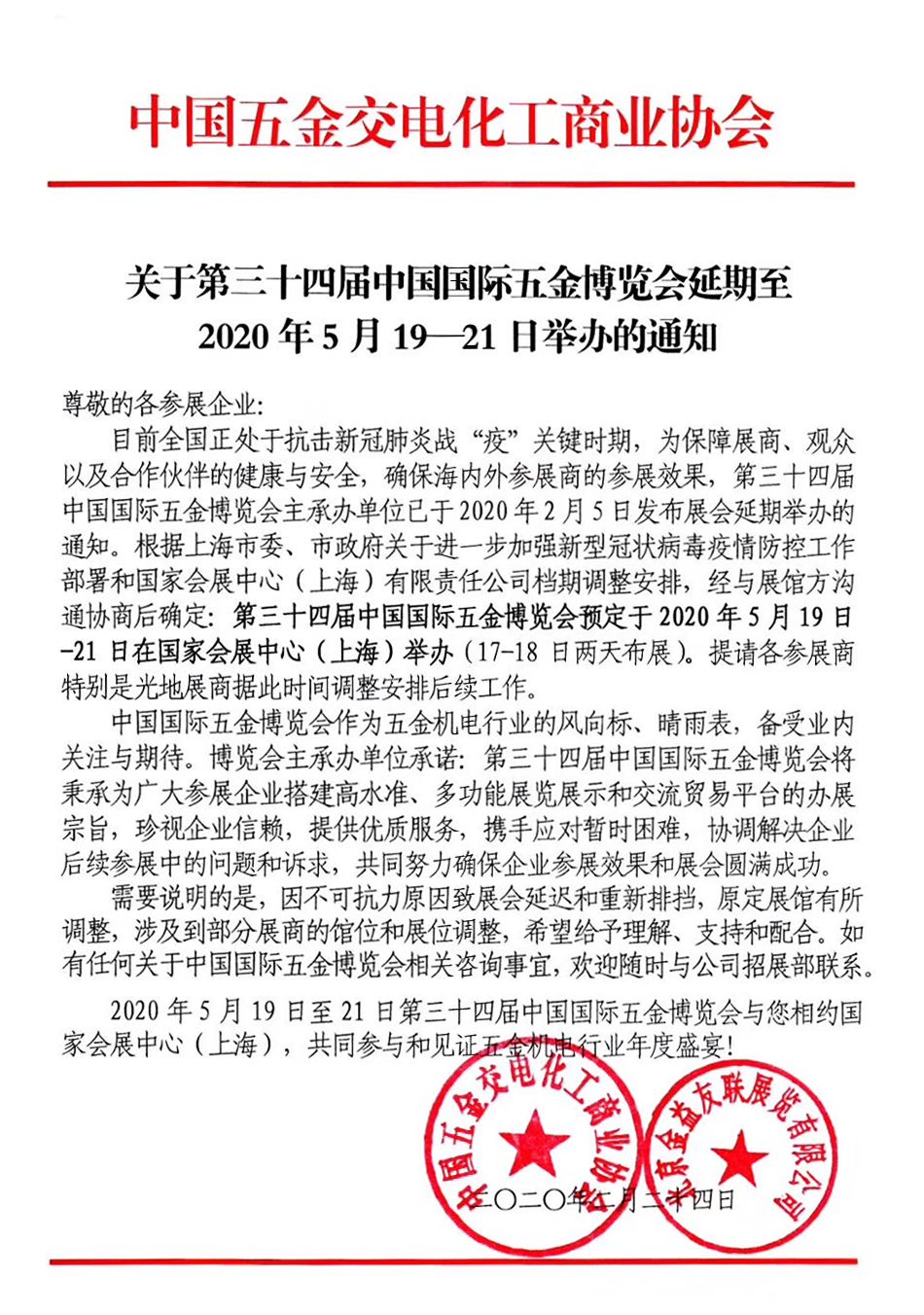 根據(jù)五金展設計搭建公司領(lǐng)藝展覽解到,為進一步落實新型冠狀病毒感染肺炎疫情防控工作,更為了切實保障廣大參展商、觀眾及合作伙伴的生命安全和身體健康,第三十四屆中國國際五金博覽會預定于2020年5月19-21日在國家會展中心舉辦。如需五金展設計請聯(lián)系領(lǐng)藝展覽,希望我們能在五金展搭建上為您添磚加瓦,祝各位朋友收獲多多,滿載而歸!
