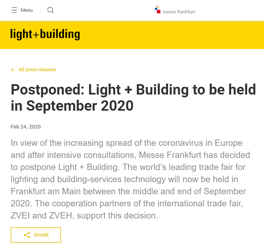 根據(jù)照明展設(shè)計搭建公司領(lǐng)藝展覽了解到,鑒于冠狀病毒在歐洲的蔓延以及經(jīng)過深入的磋商,法蘭克福展覽有限公司已決定推遲Light + Building。現(xiàn)世界領(lǐng)先的照明和建筑服務(wù)技術(shù)貿(mào)易展覽會將延期至2020年9月中旬至美因河畔法蘭克福舉行。如需照明展設(shè)計請聯(lián)系領(lǐng)藝展覽,希望我們能在照明展搭建上為您添磚加瓦,祝各位朋友收獲多多,滿載而歸!