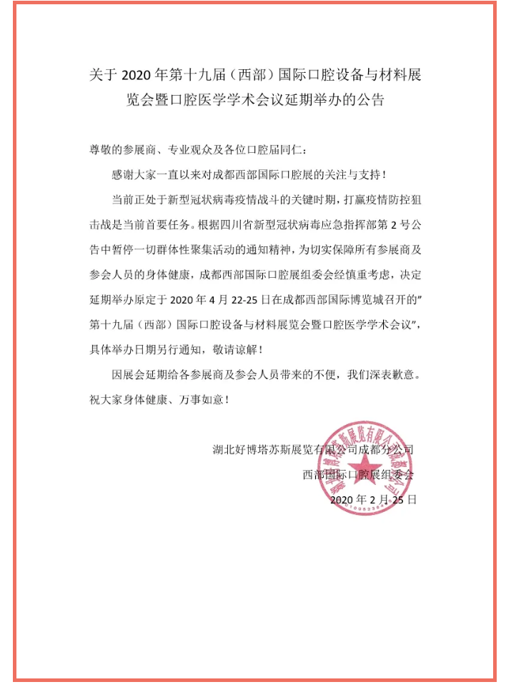 根據(jù)成都西部國(guó)際口腔展設(shè)計(jì)搭建公司領(lǐng)藝展覽了解到,當(dāng)前正處于新型冠狀病毒疫情戰(zhàn)斗的關(guān)鍵時(shí)期,打贏疫情防控狙擊戰(zhàn)是當(dāng)前首要任務(wù)。根據(jù)四川省新型冠狀病毒應(yīng)急指揮部第2號(hào)公告中暫停一切群體性聚集活動(dòng)的通知精神,為保障所有參展商及參會(huì)人員的安全和健康,成都西部國(guó)際口腔展組委會(huì)經(jīng)慎重考慮,決定延期舉辦原定于2020年4月22-25日在成都西部國(guó)際博覽城召開的“第十九屆(西部)國(guó)際口腔設(shè)備與材料展覽會(huì)暨口腔醫(yī)學(xué)學(xué)術(shù)會(huì)議”,具體舉辦日期另行通知,敬請(qǐng)諒解!如需成都口腔展設(shè)計(jì)請(qǐng)聯(lián)系領(lǐng)藝展覽,希望我們能在口腔展搭建上為您添磚加瓦,祝各位朋友收獲多多,滿載而歸!