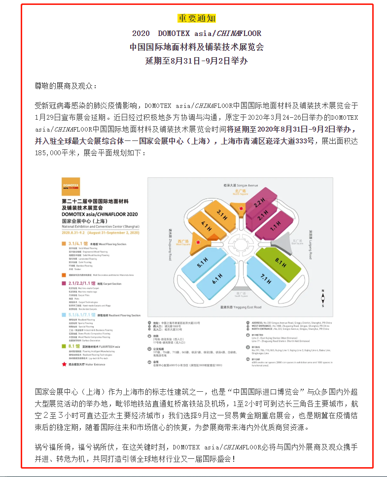 根據(jù)地材展設(shè)計(jì)搭建公司領(lǐng)藝展覽了解到,受新冠病毒感染的肺炎疫情影響,DOMOTEX asia/CHINAFLOOR中國(guó)國(guó)際地面材料及鋪裝技術(shù)展覽會(huì)于1月29日宣布展會(huì)延期。近日經(jīng)過積極地多方協(xié)調(diào)與溝通,原定于2020年3月24-26日舉辦的DOMOTEX asia/CHINAFLOOR中國(guó)國(guó)際地面材料及鋪裝技術(shù)展覽會(huì)時(shí)間將延期至2020年8月31日-9月2日舉辦,并入駐全球最大會(huì)展綜合體——國(guó)家會(huì)展中心(上海),上海市青浦區(qū)崧澤大道333號(hào)。如需地材展設(shè)計(jì)請(qǐng)聯(lián)系領(lǐng)藝展覽,希望我們能在地材展搭建上為您添磚加瓦,祝各位朋友收獲多多,滿載而歸!