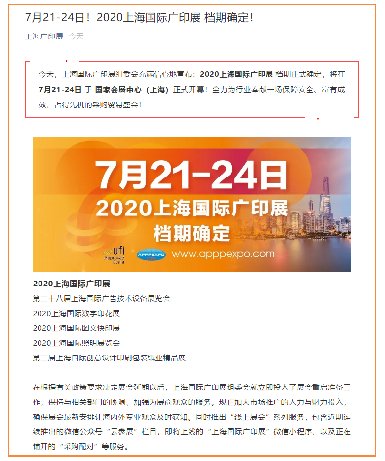 根據(jù)上海廣印展設(shè)計(jì)搭建公司領(lǐng)藝展覽了解到,今天,上海國際廣印展組委會(huì)充滿信心地宣布:2020上海國際廣印展 檔期正式確定,將在7月21-24日 于 國家會(huì)展中心(上海)正式開幕!全力為行業(yè)奉獻(xiàn)一場(chǎng)保障安全、富有成效、占得先機(jī)的采購貿(mào)易盛會(huì)!如需上海廣印展設(shè)計(jì)請(qǐng)聯(lián)系領(lǐng)藝展覽,希望我們能在上海廣印展搭建上為您添磚加瓦,祝各位朋友收獲多多,滿載而歸!