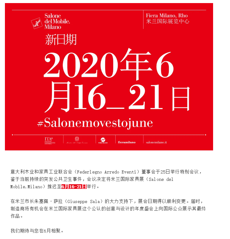 根據家具展展臺設計公司領藝展覽了解到,意大利木業和家具工業聯合會(Federlegno Arredo Eventi)董事會于25日舉行特別會議,鑒于當前持續的突發公共衛生事件,會議決定將米蘭國際家具展(Salone del Mobile.Milano)推遲至6月16-21日舉行。在米蘭市長朱塞佩·薩拉(Giuseppe Sala)的大力支持下,展會日期得以順利變更。屆時,制造商將有機會在米蘭國際家具展這個公認的創意與設計的年度盛會上向國際公眾展示其最終作品。如需家具展展位設計裝修請聯系領藝展覽,希望我們能在家具展布展搭建上為您添磚加瓦,祝各位朋友收獲多多,滿載而歸!