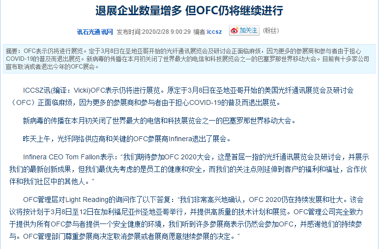 根據光纖通訊展設計搭建公司領藝展覽了解到,Infinera CEO Tom Fallon表示:“我們期待參加OFC 2020大會,這是首屈一指的光網絡會議,并展示我們的最新創新成果,但我們最優先考慮的是員工的健康和安全,而我們的關注點則延伸到客戶的福利和福祉,合作伙伴和我們社區中的其他人。”OFC管理層對Light Reading的詢問作了以下答復:“我們非常高興地確認,OFC 2020仍在持續發展和壯大。該會議將按計劃于3月8日至12日在加利福尼亞州圣地亞哥舉行,并提供高質量的技術計劃和展覽。OFC管理公司完全致力于提供為所有OFC參與者提供一個安全健康的環境,我們聽到許多參展商表示仍然會參加OFC,并感謝他們的持續參與。OFC管理部門尊重參展商決定取消參展并愿意合作的決定。”如需光纖通訊展設計請聯系領藝展覽,希望我們能在光纖通訊展搭建上為您添磚加瓦,祝各位朋友收獲多多,滿載而歸!