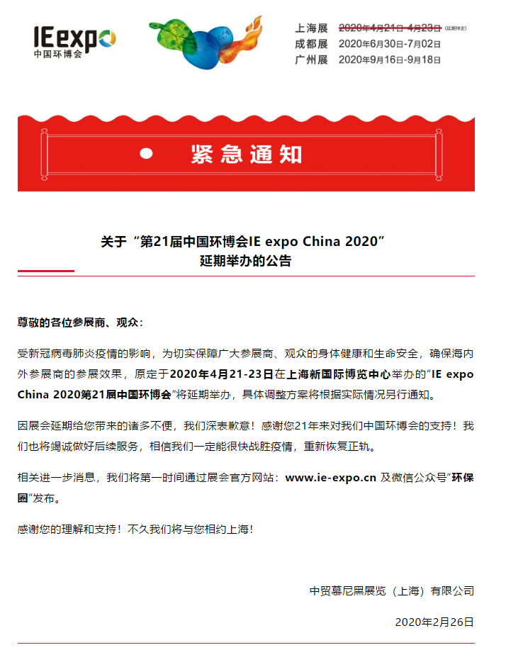 根據環博會設計搭建公司領藝展覽了解到,受新冠病毒肺炎疫情的影響,為切實保障廣大參展商、觀眾的身體健康和生命安全,確保海內外參展商的參展效果,原定于2020年4月21-23日在上海新國際博覽中心舉辦的“IE expo China 2020第21屆中國環博會”將延期舉辦,具體調整方案將根據實際情況另行通知。相信我們一定能很快戰勝疫情,重新恢復正軌。相關進一步消息,主辦將第一時間通過展會官方網站:www.ie-expo.cn 及微信公眾號“環保圈”發布。如需環博會設計請聯系領藝展覽,希望我們能在環博會搭建上為您添磚加瓦,祝各位朋友收獲多多,滿載而歸!
