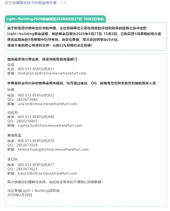 根據照明展展臺設計公司領藝展覽了解到,由于新型冠狀病毒在歐洲的傳播,法蘭克福展覽公司在慎重的評估和密集的磋商之后決定把Light+building展會延期,新的展會日期為2020年9月27日-10月2日。已購買原3月展期的觀眾通票在延期后的9月展期中仍然有效。請各位展商、觀眾及時調整出行計劃。感謝大家的耐心等待和支持!讓我們九月相約法蘭克福!如需照明展展位設計裝修請聯系領藝展覽,希望我們能在照明展布展搭建上為您添磚加瓦,祝各位朋友收獲多多,滿載而歸!