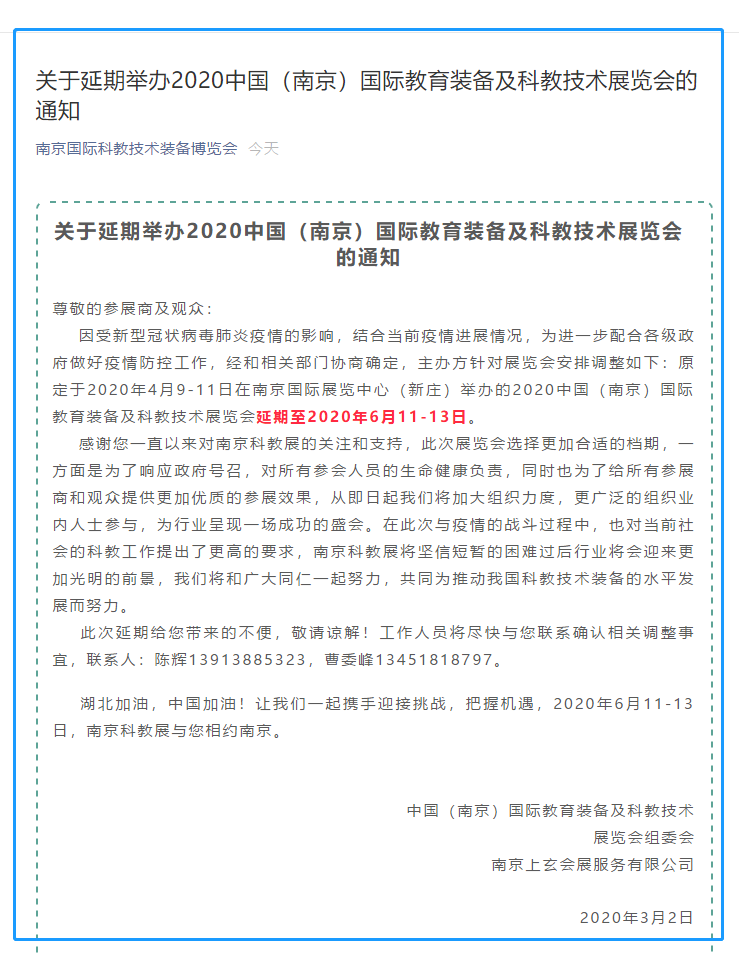 根據教育展設計搭建公司領藝展覽了解到,因受新型冠狀病毒肺炎疫情的影響,結合當前疫情進展情況,為進一步配合各級政府做好疫情防控工作,經和相關部門協商確定,主辦方針對展覽會安排調整如下:原定于2020年4月9-11日在南京國際展覽中心(新莊)舉辦的2020中國(南京)國際教育裝備及科教技術展覽會延期至2020年6月11-13日。如需教育展設計請聯系領藝展覽,希望我們能在教育展搭建上為您添磚加瓦,祝各位朋友收獲多多,滿載而歸!