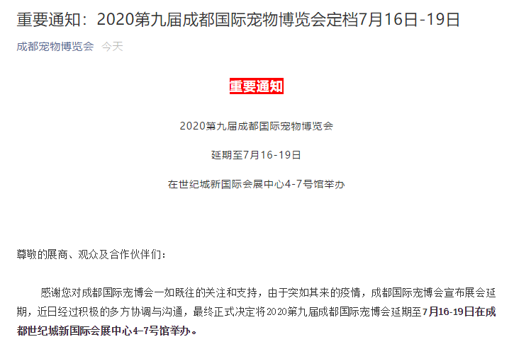 根據成都寵物展設計搭建公司領藝展覽了解到,由于突如其來的疫情,成都國際寵博會宣布展會延期,近日經過積極的多方協調與溝通,最終正式決定將2020第九屆成都國際寵博會延期至7月16-19日在成都世紀城新國際會展中心4-7號館舉辦。如需成都寵物展設計請聯系領藝展覽,希望我們能在成都寵物展搭建上為您添磚加瓦,祝各位朋友收獲多多,滿載而歸!