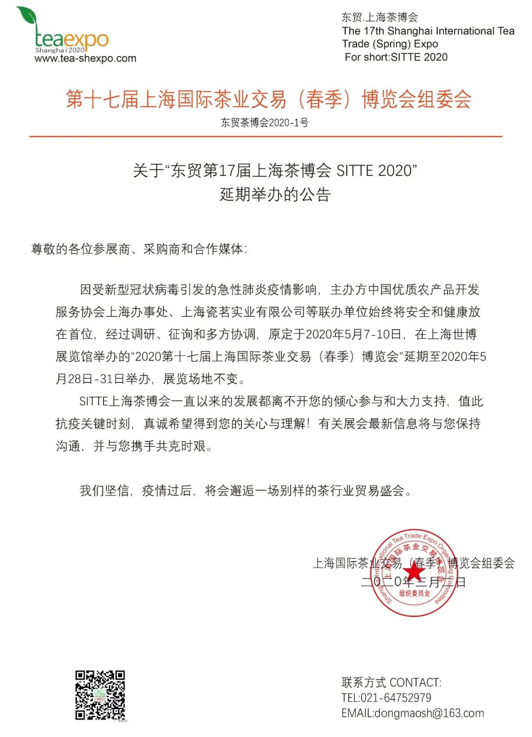 根據上海春季茶博會設計搭建公司領藝展覽了解到,因受新型冠狀病毒肺炎疫情的影響,原定于2020年5月7-10日,在上海世博展覽館舉辦的“2020第十七屆上海國際茶業交易(春季)博覽會”延期至2020年5月28-31日舉辦,展覽場地不變。如需上海茶博會設計請聯系領藝展覽,希望我們能在上海茶博會搭建上為您添磚加瓦,祝各位朋友收獲多多,滿載而歸!