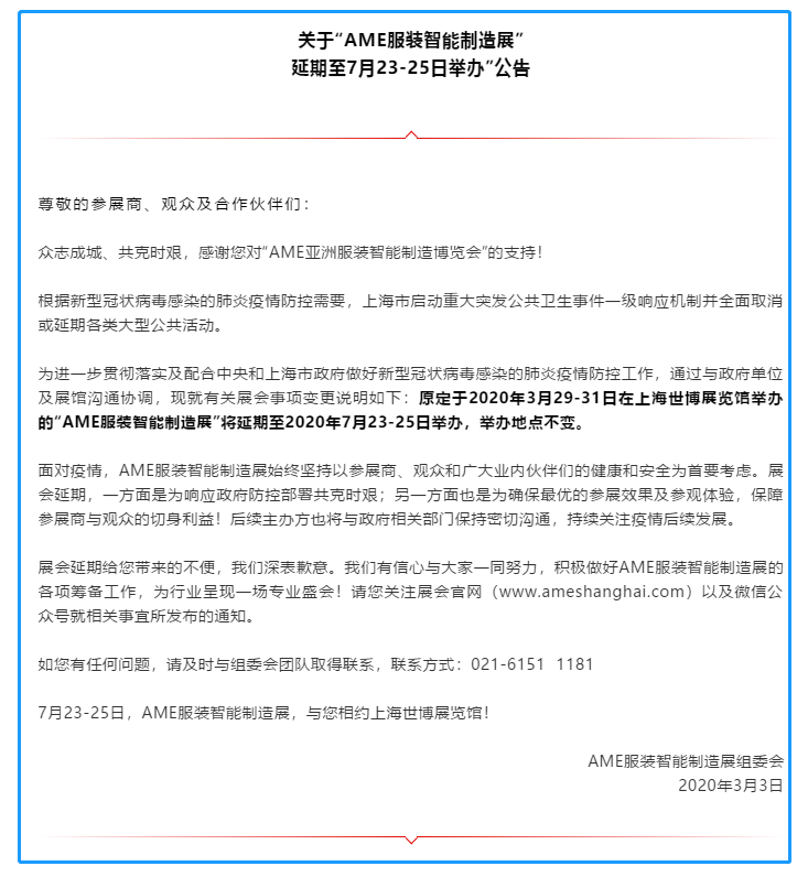 根據上海服裝展設計搭建公司領藝展覽了解到,原定于2020年3月29-31日在上海世博展覽館舉辦的“AME服裝智能制造展”將延期至2020年7月23-25日舉辦,舉辦地點不變。如需上海展臺設計請聯系領藝展覽,希望我們能在上海展臺搭建上為您添磚加瓦,祝各位朋友收獲多多,滿載而歸!