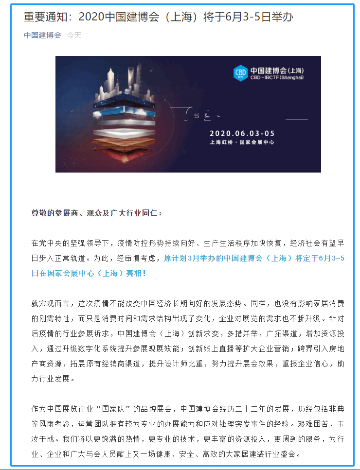 根據上海建博會設計搭建公司領藝展覽了解到,原計劃3月舉辦的中國建博會(上海)將定于6月3-5日在國家會展中心(上海)亮相!全力為行業奉獻一場保障安全、富有成效、占得先機的采購貿易盛會!如需上海建博會設計請聯系領藝展覽,希望我們能在上海建博會搭建上為您添磚加瓦,祝各位朋友收獲多多,滿載而歸!