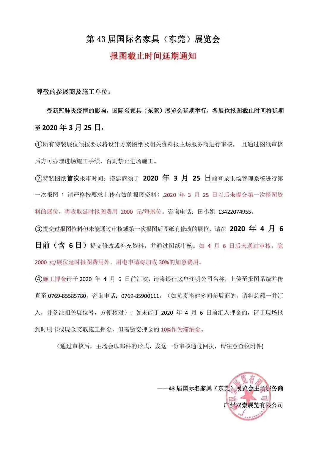 根據東莞名家具展設計搭建公司領藝展覽了解到,受新冠肺炎疫情的影響。國際名家具展(延期)舉行,各展位截止報圖時間將延期至2020年3月25日。如需名家具展設計請聯系領藝展覽,希望我們能在名家具展搭建上為您添磚加瓦,祝各位朋友收獲多多,滿載而歸!