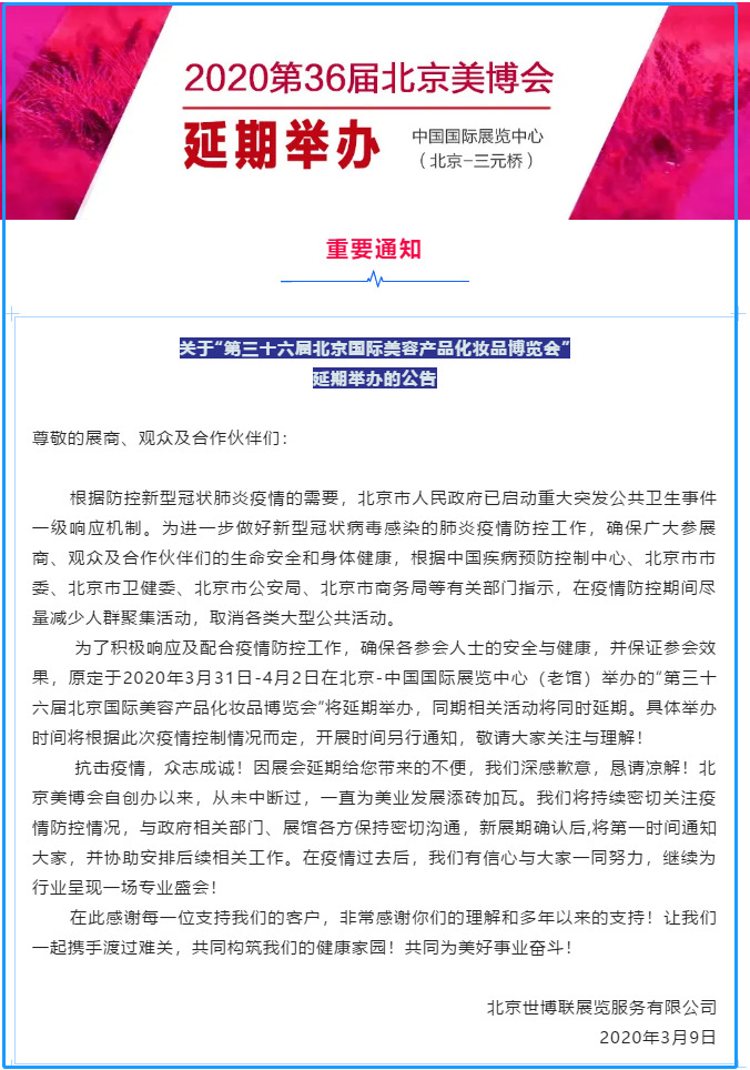 根據美博會展臺設計搭建公司領藝展覽了解到,為了積極響應及配合疫情防控工作,確保各參會人士的安全與健康,并保證參會效果,原定于2020年3月31日-4月2日在北京-中國國際展覽中心(老館)舉辦的“第三十六屆北京國際美容產品化妝品博覽會”將延期舉辦,同期相關活動將同時延期。如需美博會展臺設計請聯系領藝展覽,希望我們能在美博會展臺搭建上為您添磚加瓦,祝各位朋友收獲多多,滿載而歸!