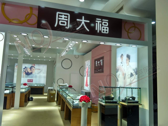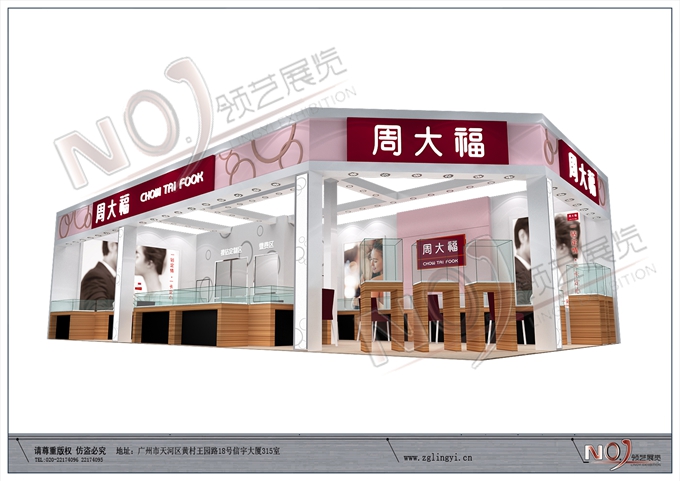 契合周大福的品牌形象和產(chǎn)品特性,采用矩形結(jié)構(gòu),再搭配燈具燈光的效果,襯托出展位高端、時(shí)尚的氛圍,突出一種現(xiàn)代、歐美的時(shí)尚品味。